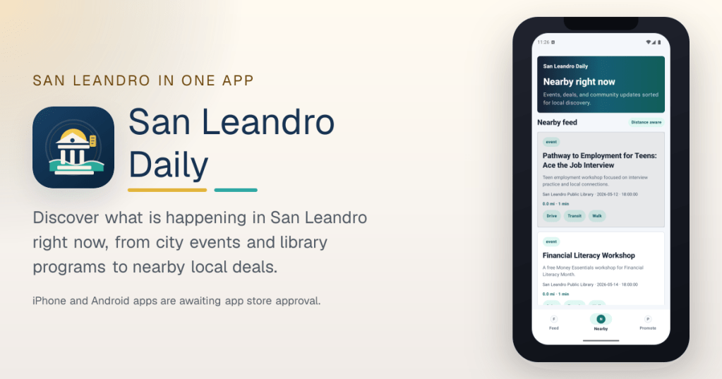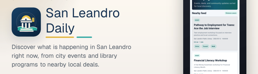 The goal is not to build a generic city app and stamp a local name on it. The goal is to build something that respects the actual rhythms of San Leandro: library events, public meetings, neighborhood happenings, family programs, local deals, and the many small signals that tell you a city is alive if you are paying attention. Under the hood, the work is fairly straightforward on purpose: a FastAPI backend, PostgreSQL for content, and a cross-platform mobile stack that keeps the product maintainable. The technology matters, but only because it helps the city show up more clearly.